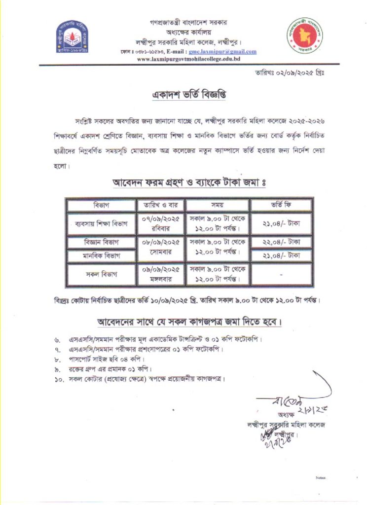 একাদশ ভর্তি বিজ্ঞপ্তি 2025-2026 Leave a Comment / By Laxmipur Govt. Mohila College / September 2, 2025