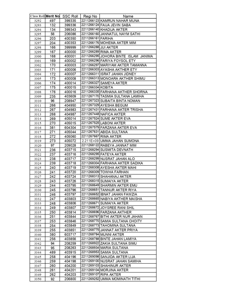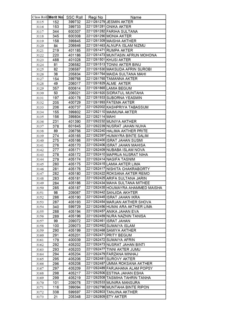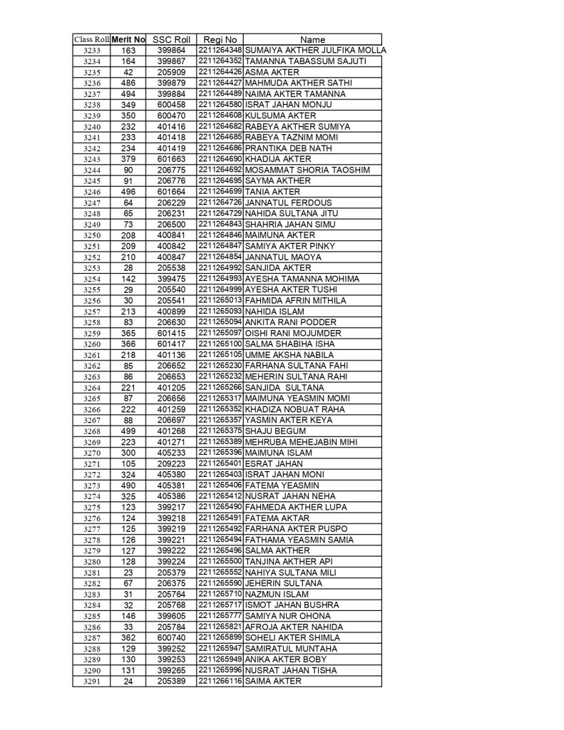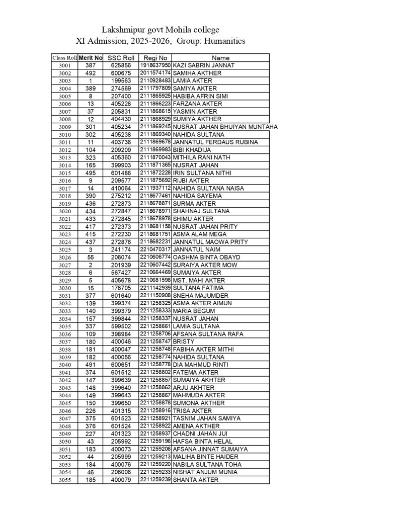 লক্ষ্মীপুর সরকারি মহিলা কলেজে ২০২৫-২০২৬ শিক্ষা বর্ষে একাদশ শ্রেণীতে ভর্তিকৃত মানবিক বিভাগের শিক্ষার্থীদের ক্লাস রোল নম্বর।