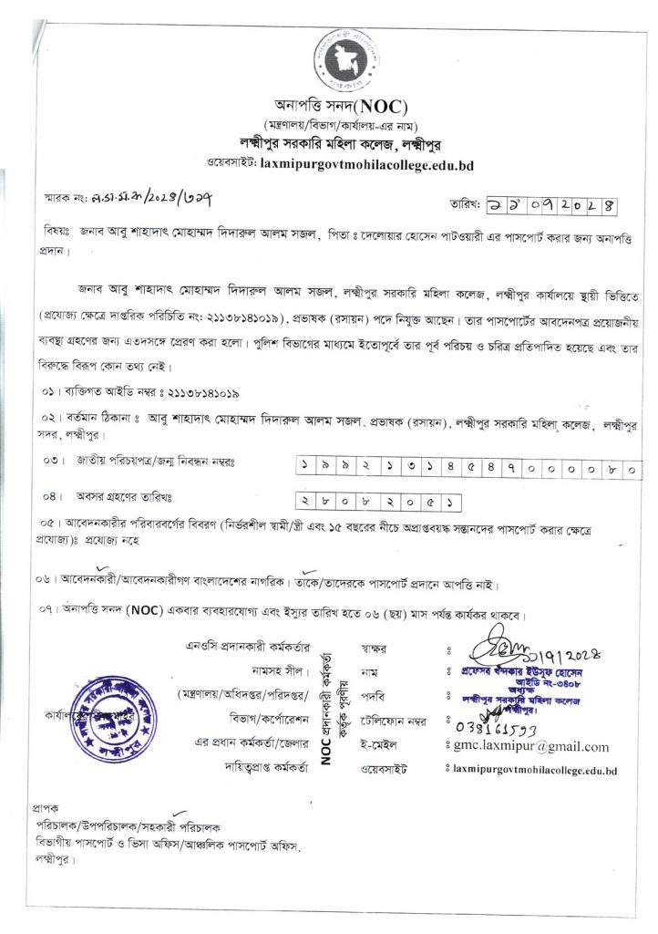 NOC OF ABU SAHDAT MOHAMMAD DIDARUL ALAM SAZAL Leave a Comment / By Laxmipur Govt. Mohila College / July 11, 2024